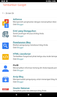 Bagian gadget blogger ada menampilka 26-26 gadget namun untuk ditampilkan kadang hanya html/javascript yang lainya tidak dipasangkan dengan alasan membuat blog loadnya lemot/lambat.